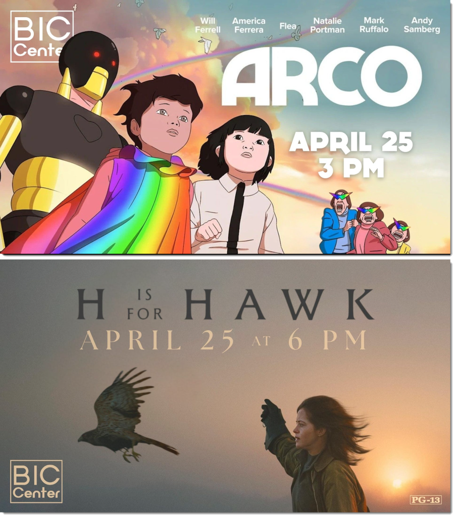 As the week winds toward the weekend, Saturday brings a pair of featured movies. Arco shows at 3:00 p.m. It’s an animated sci-fi adventure that’s great for kids with a PG rating. At 6:00, H is for Hawk tells the story of Helen who grieving at the death of her dad finds herself saved by an unlikely friendship with a stubborn hawk. It’s rated PG-13.