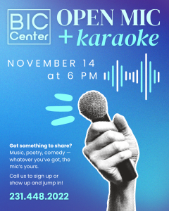Friday at 6:00 PM in the Theater dishes up a new treat for local performers and performance-lovers – Open Mic + Karaoke! Ready to show off your talent or just cheer on the brave souls who do? This is your night! Once a month, we’re handing the mic to YOU. Sing a song, drop a poem, tell a joke, strum a tune… or just sit back and soak up the vibes. Local treasure Herb Ledbetter will host, lending his wit and musical talent to the evening, and you never know what surprise performances might pop up. Oh—and yes, karaoke is totally on deck for all you shower superstars.Want to sign up early? Call (231) 448-2022. Or just show up and jump in! Free to perform, free to watch, BYOB, and all ages and talents welcome. Let’s make some memories and have some fun!